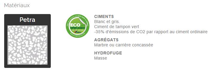 Le mélange associe des ciments blanc et gris, complétés par un ciment de tampon vert permettant de réduire de 35% les émissions de CO2 par rapport à un ciment ordinaire, un atout important pour les collectivités engagées dans des démarches bas carbone.