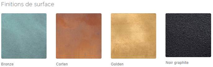 Vous pouvez également opter pour des finitions de surface Bronze, Corten, Golden ou Noir graphite, obtenues via des revêtements à base de liants intégrant des charges de métal concassé.