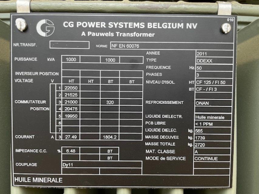 Vous retrouvez ici deux transformateurs tri-phasés CG Power Systems Belgium NV (Pauwels), tous deux couplés en Dy11, refroidis naturellement (ONAN), et respectant la norme NF EN 60076. Ils sont parfaitement adaptés à vos installations extérieures, industrielles, ou vos infrastructures de production et distribution d’énergie.