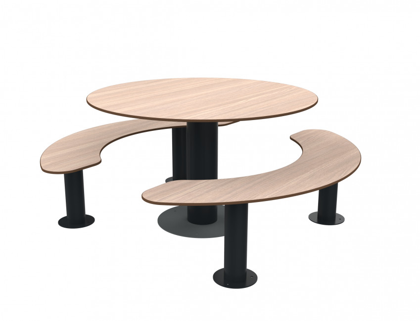 table pique-nique ronde avec assises séparées en acier et bois en compact HPL allie robustesse, design et confort d’utilisation.