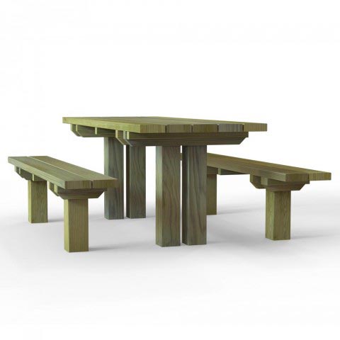Fourniture et pose d’un ensemble table de pique-nique et bancs en bois à sceller de chez techni-contact réf. 4645488 ou techniquement équivalent, pin traité autoclave classe 4, pieds et traverses section 120 x 120 mm, planche table et banc section 45 x 145 mm, visserie acier galvanisé Longueur totale : 2000 mm