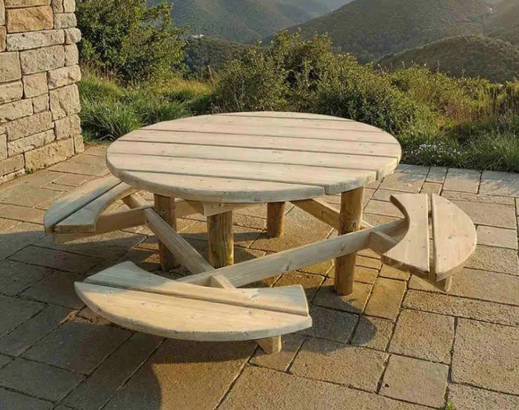Avec un poids de 152 kg, cette table pique-nique ronde en bois se distingue par sa stabilité naturelle.