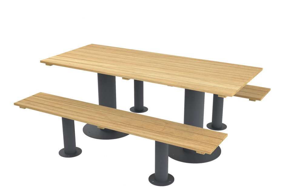 L’espace libre sous les bancs et la hauteur ergonomique de l’assise améliorent le confort d’utilisation, que ce soit pour de courts temps de pause ou des repas prolongés.