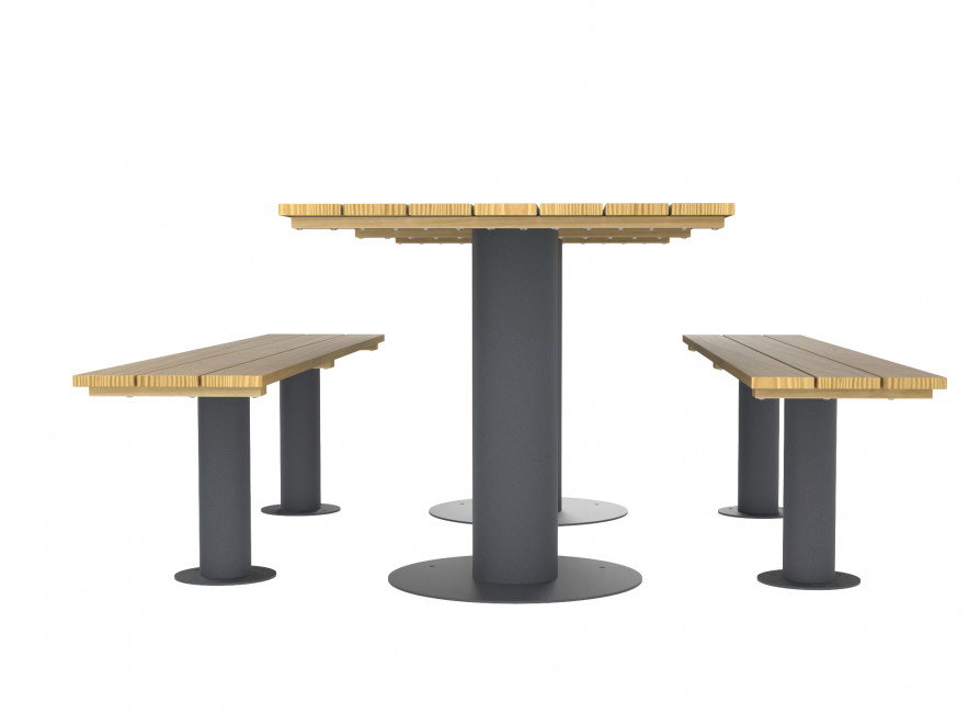 Le piètement anthracite mat RAL 7016 met en valeur les lattes de robinier et l’aspect bois du compact HPL, pour une table pique-nique acier bois au style contemporain et facile à intégrer dans différents environnements urbains ou paysagers.