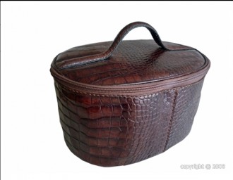 Luxueuse mallette de type vanity, en cuir de vachette façon croco, dotée d'une fermeture zippée, dont l'intérieur, doublé de