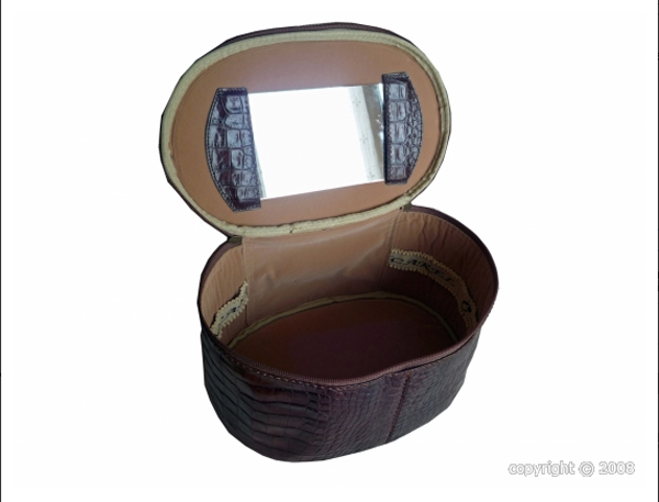 Luxueuse mallette de type vanity, en cuir de vachette façon croco, dotée d'une fermeture zippée, dont l'intérieur, doublé de velours de coton mélangé de couleur miel, présente huit emplacements pour pinceaux et une pochette. Elle dispose d'un miroir sur le couvercle.