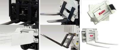 Ce modèle peut être équipé de fourches spécifiques, d'une pince à balles ou d'un retourneur de fût , pour répondre aux exigences des secteurs de la logistique, du bâtiment et de l'industrie .