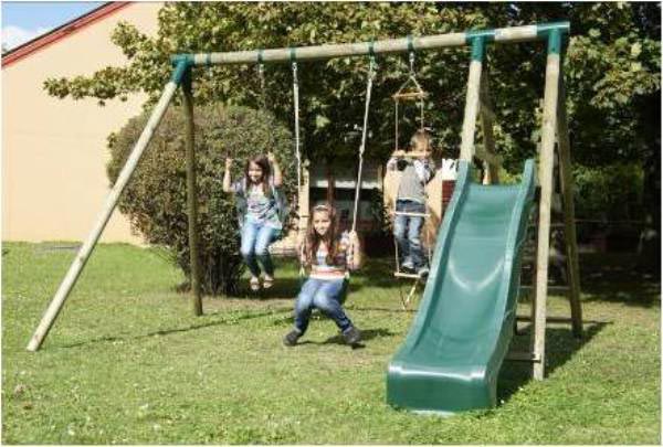 Ce portique est composé de 3 éléments : Une échelle - 2 balançoires - 1 Toboggan, avec accessoires et kit d'ancrage inclus.