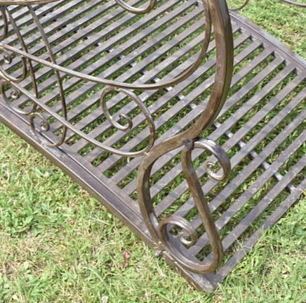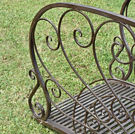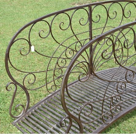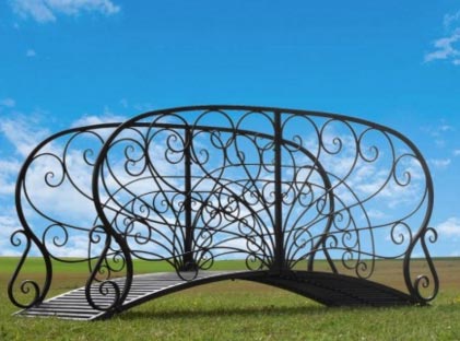 Un pont jardin en fer patiné marron, d’une belle esthétique et d'une décoration élégante.