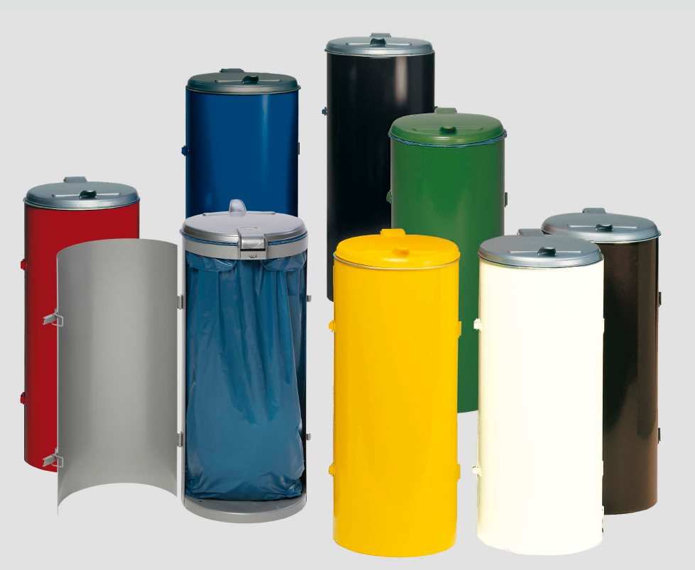 Le socle est muni de perforations pour ancrage au sol. Changement facile des sacs-poubelle par anneau de serrage.