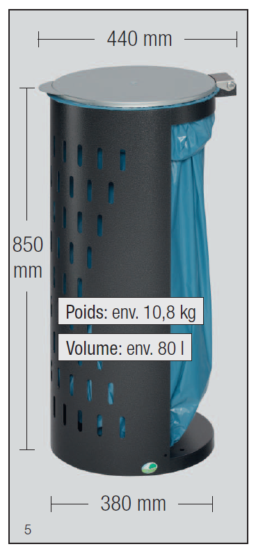 Équipée d‘un couvercle métallique, revêtu argent et un anneau métallique pour la fixation du sac poubelle.