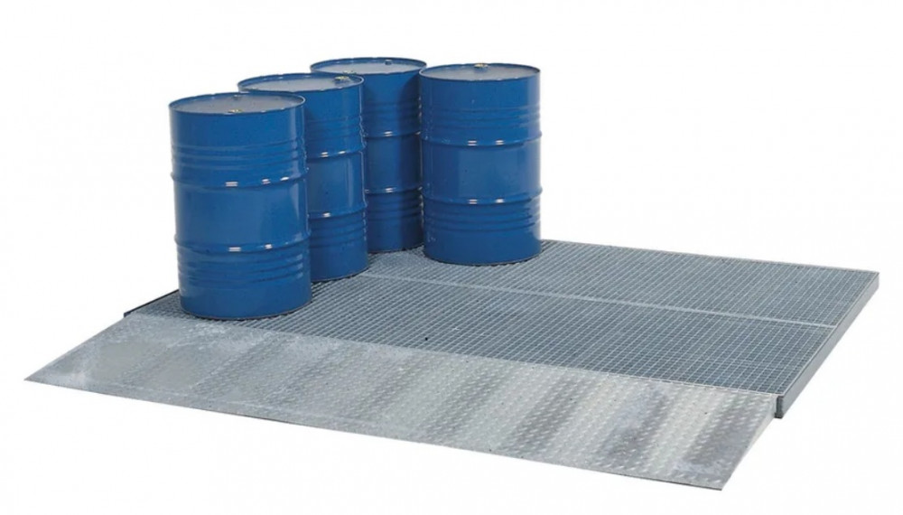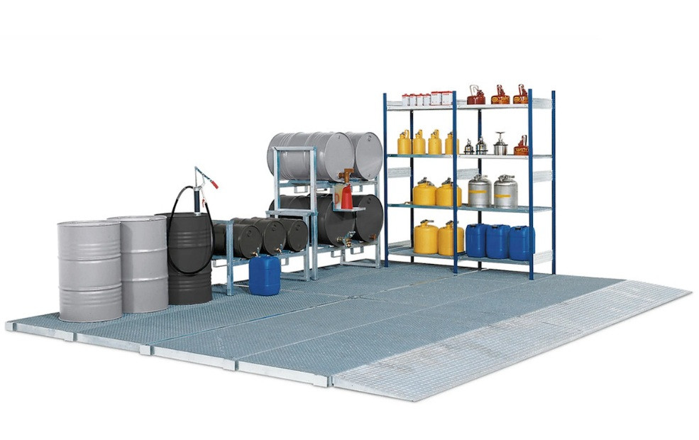 Découvrez notre plateforme de rétention en acier galvanisé, un équipement de sécurité indispensable pour le stockage des liquides :