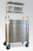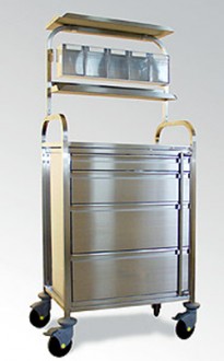 - Composition de base identique au chariot (sans étagère) avec en plus un portique supérieur pour appareils médicaux avec une tablette et une étagère en inox.