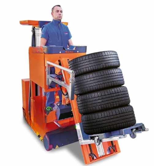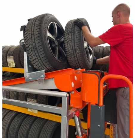 Ce chariot préparateur de commande avec double outil permet de soulever, déplacer et stocker un jeu complet de pneus.