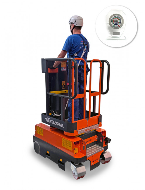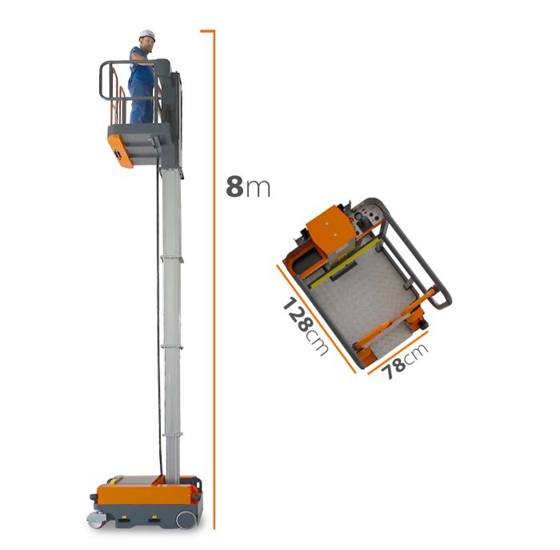 Avec un encombrement au sol de seulement 1280 x 780 mm, cette mini nacelle élévatrice est idéale pour évoluer dans les zones étroites.