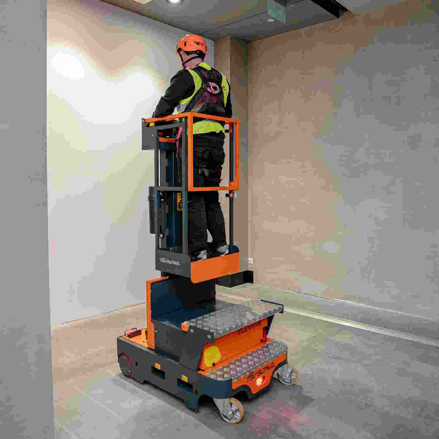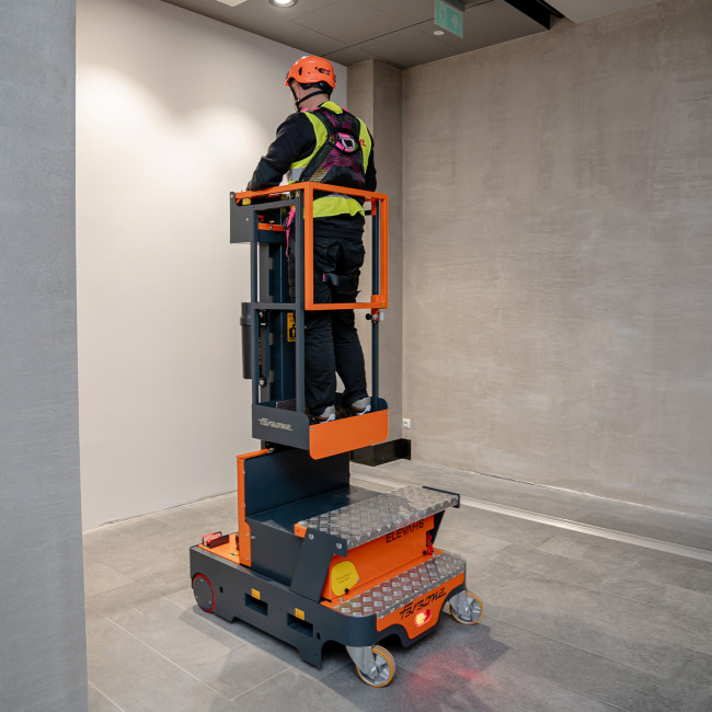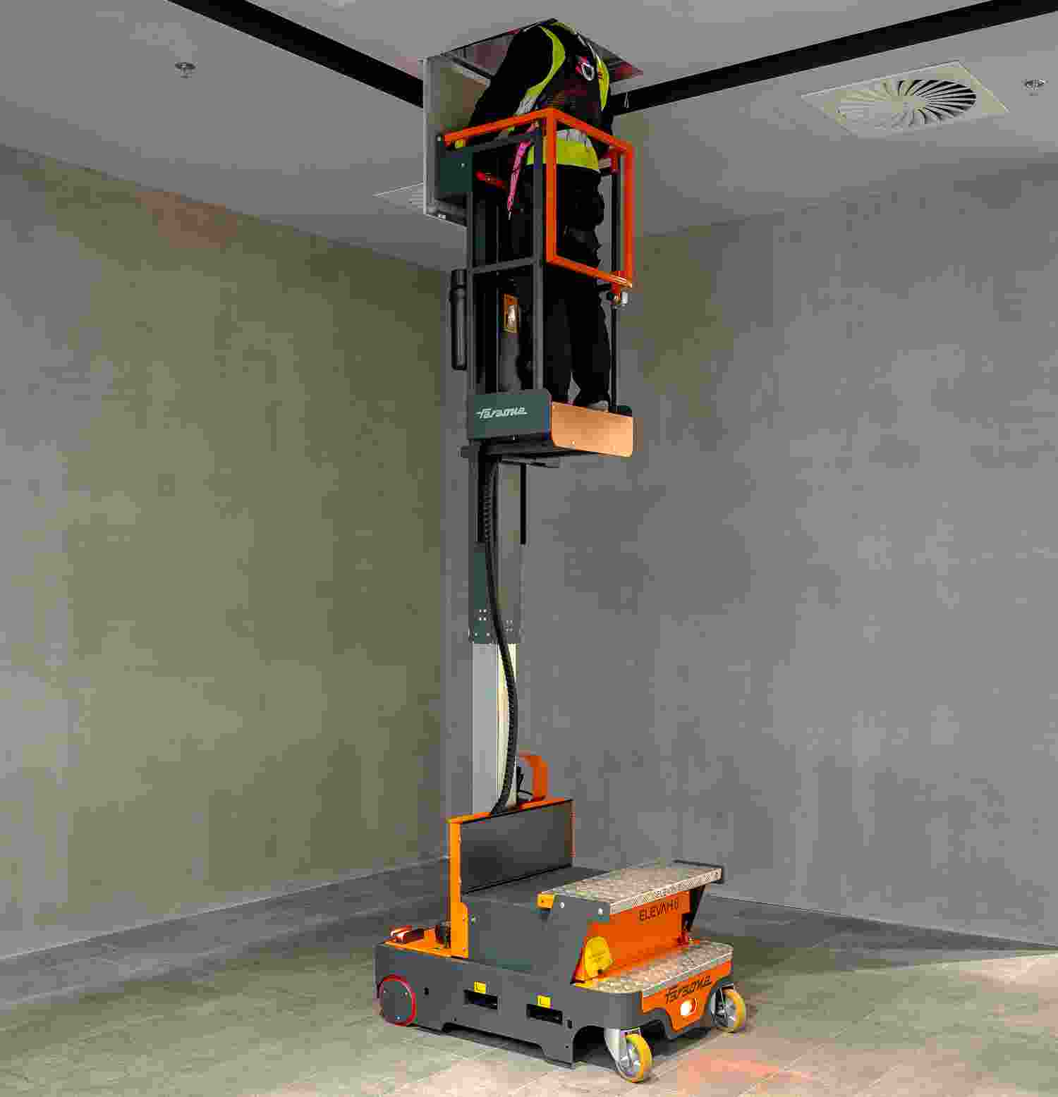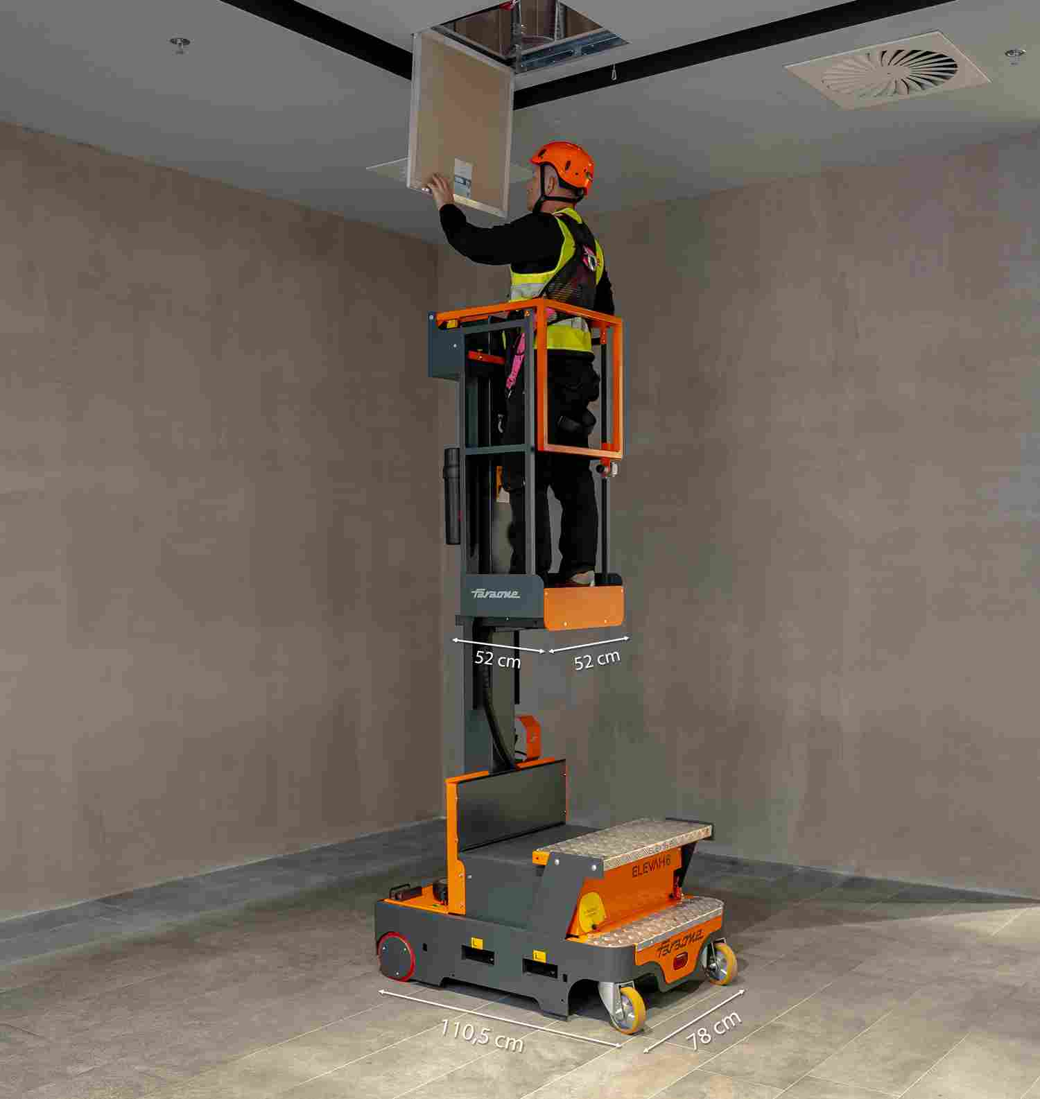 Cette nacelle élévatrice à panier ultra compact permet d'intervenir en toute sécurité dans les faux plafonds, les passages étroits et les espaces confinés.