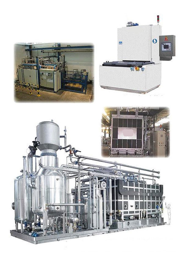 Machine pour dégraissage industriel, permet en utilisant les solvants chlorés ou A3 de s'adapter à toutes les dimensions de charges nécessaires. En fonction de la cadence utile, le choix se portera sur un séchage air chaud ou sous vide.