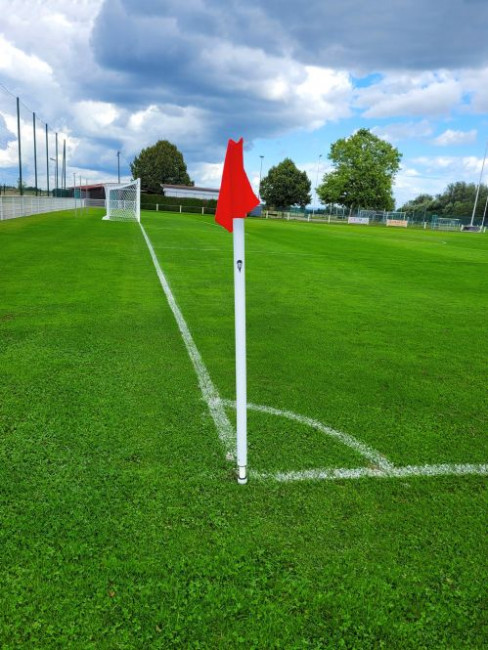 Les drapeaux de corner officiels, bien visibles, assurent une signalisation claire des angles du terrain, indispensable au bon déroulement des matchs et à la conformité avec les règlements sportifs.