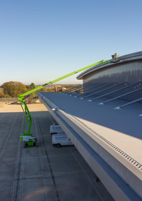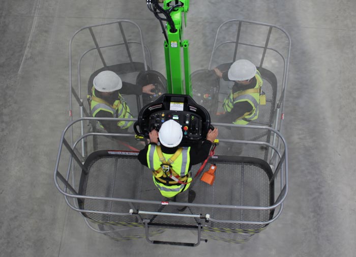 Fonctionnelle sur terrains accidentés, cette nacelle élévatrice confère une liberté de mouvement avec une rotation continue de 360° et de 180° pour la plateforme.