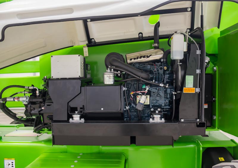 - Ceci nous permet d'équiper la nacelle Hybride 4x4 d'un plus petit moteur et donc de minimiser la consommation en carburant, tandis que son système de purification des gaz d'échappement réduit davantage les émissions CO/NOx et autres particules, ainsi que le bruit.