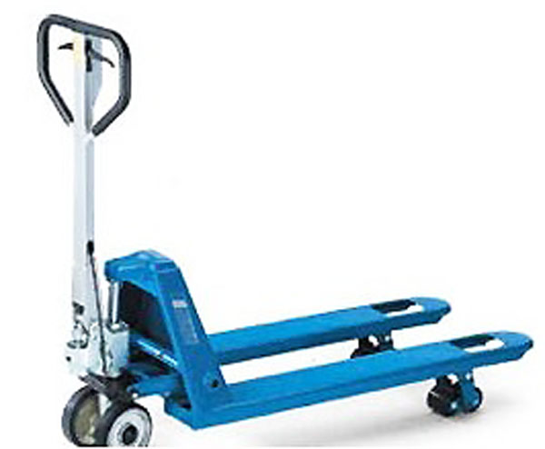Le châssis du transpalette manuel est équipé de série de roues directionnelles en caoutchouc et de galets de fourches version tandem en polyurethane.