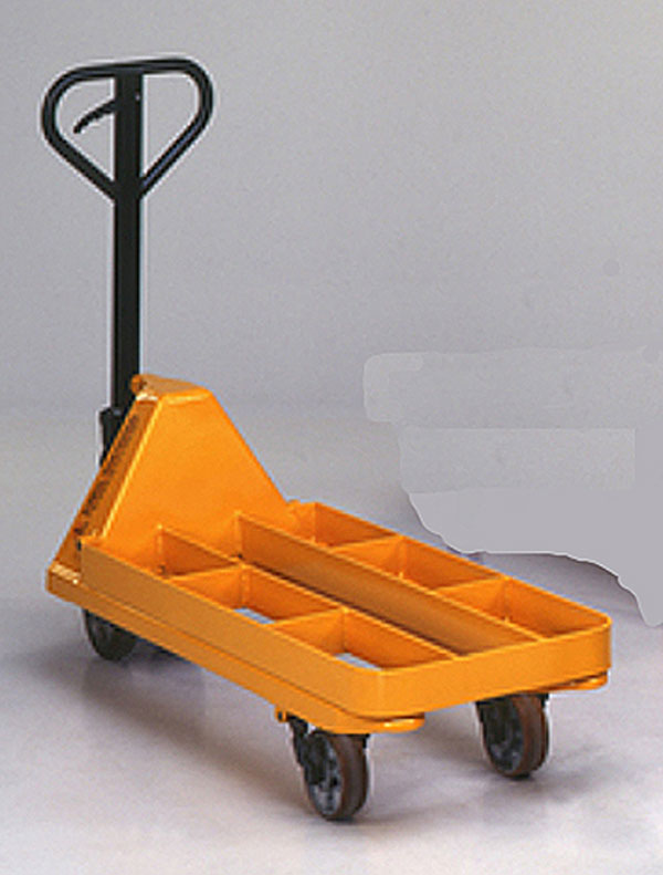 Le transpalette à plateforme hydraulique ou transplateforme est un châssis bas comportant deux fourches sur roulettes et un bouclier haut abritant le dispositif de levage, le