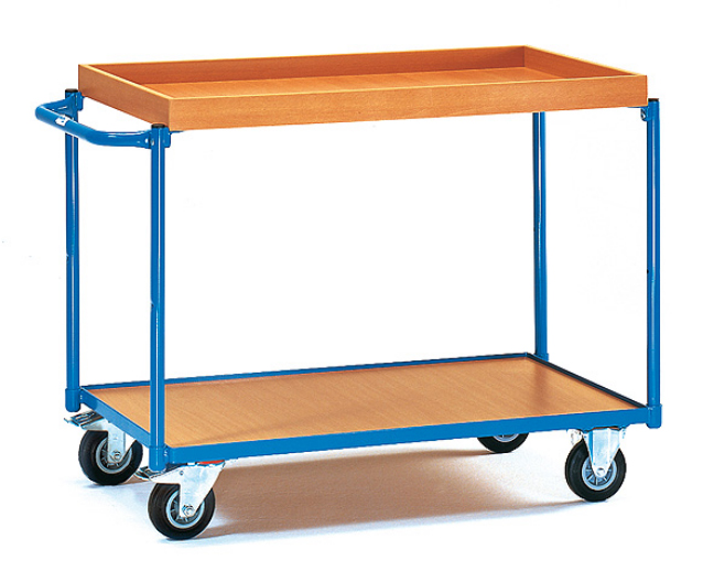 Plateaux en bois mélaminé surface effet hêtre encastrées dans les cornières, rebords 12 mm pour plateau et 45 mm pour caissette.
