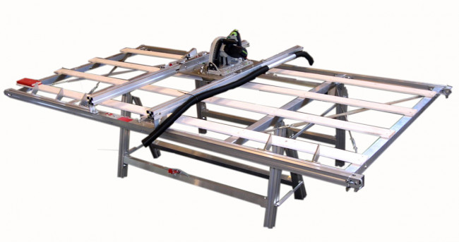 Cet outil est monté sur un châssis en aluminium et permet la coupe répétitive de panneaux de grande taille en toute sécurité.
