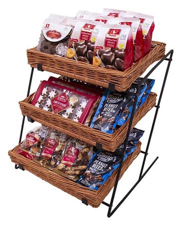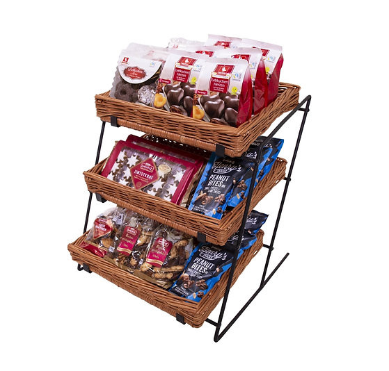 Le présentoir est constitué de trois paniers inclinés en osier, offrant une vue optimale sur les produits.