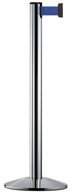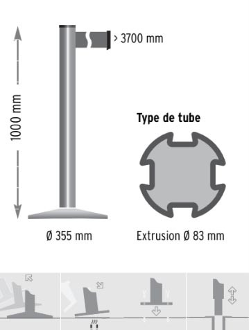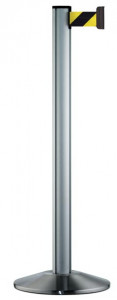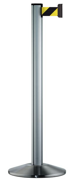 Fixé sur un socle, ce poteau est équipé d'un mécanisme de sangle à rembobinage auto freiné.