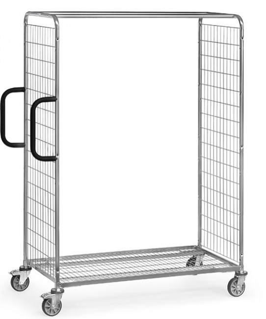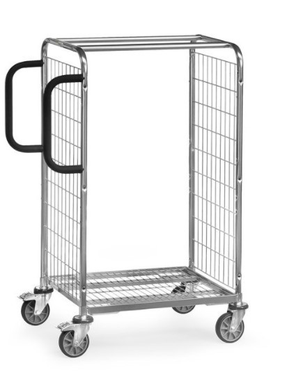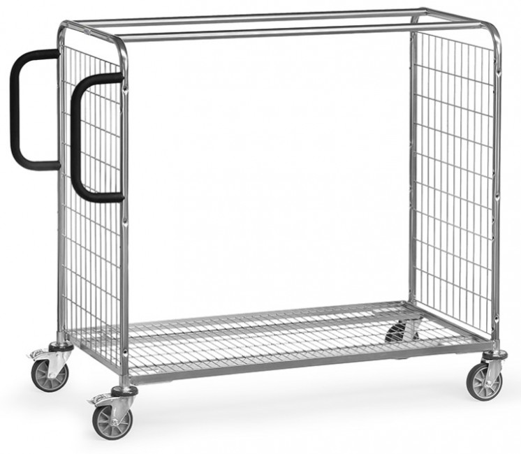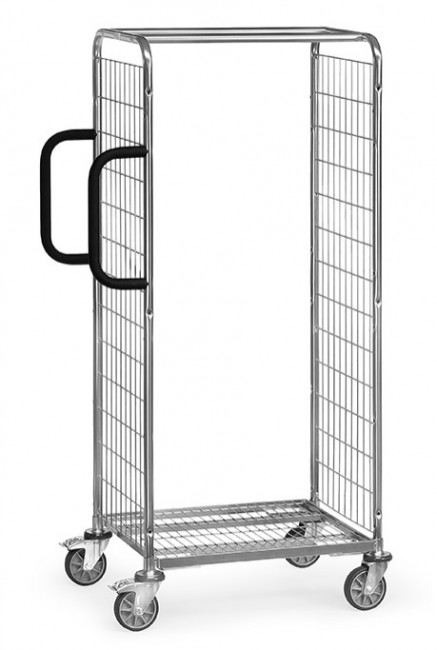 Ce chariot est équipé de 4 roues pivotantes à bandage TPE sur jantes en plastique, moyeu à roulement à billes, avec des freins sur 2 roues conformément à la Norme 1757-3 .