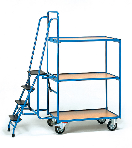 Équipé de 3 plateaux en mélaminé surface effet hêtre posés des cornières de 12 mm de haut, d’un marchepied se soulevant quand les marches sont libres et s'appuyant sur le sol par le poids de l'utilisateur.