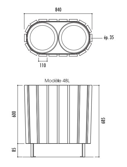 Cette corbeille urbaine double-flux (2 x 48 litres) est à sceller au sol.