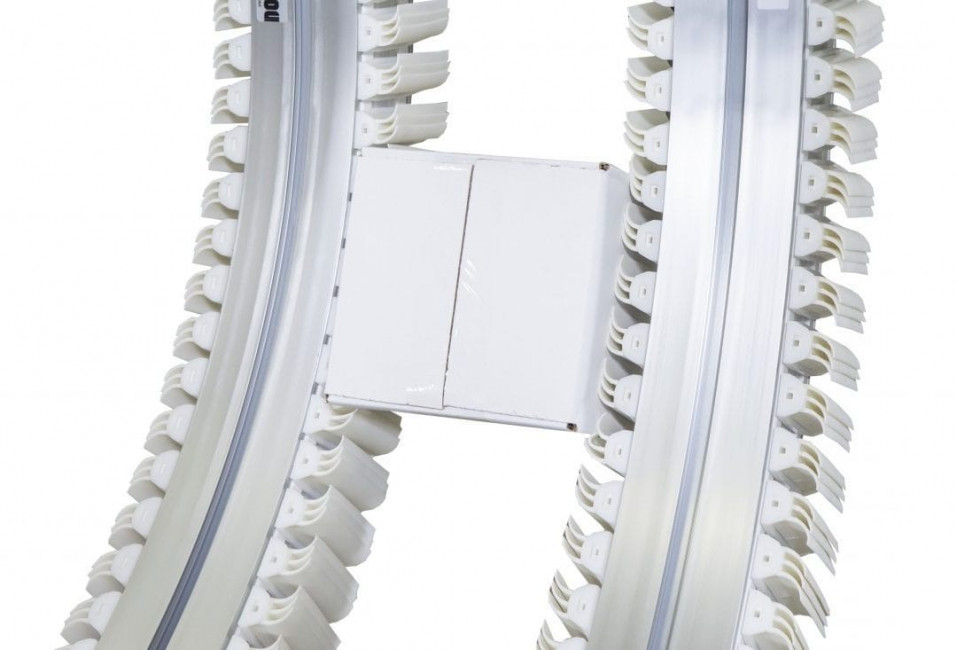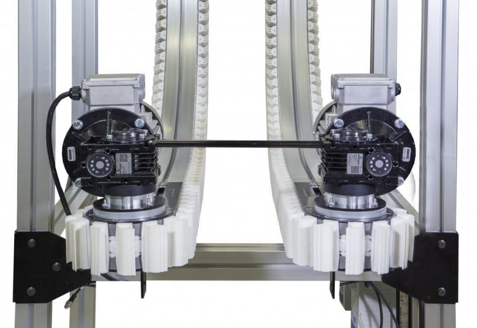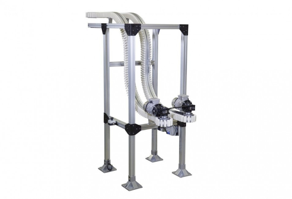 Son système ingénieux de chaînes de préhension maintient fermement les produits entre les deux convoyeurs alignés.