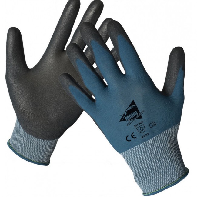 Les gants de manutention fine sont composés d'un support en nylon bleu et d’une enduction polyuréthane noire, couvrant la paume et le bout des doigts.