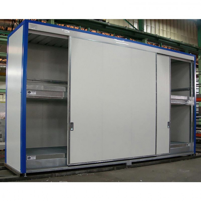 Conçu pour sécuriser le stockage de grandes quantités de produits dangereux en extérieur, le Conteneur CONT6M2NIPC est un conteneur de stockage 2 niveaux, de 6 m long, avec rétention et isolation.
