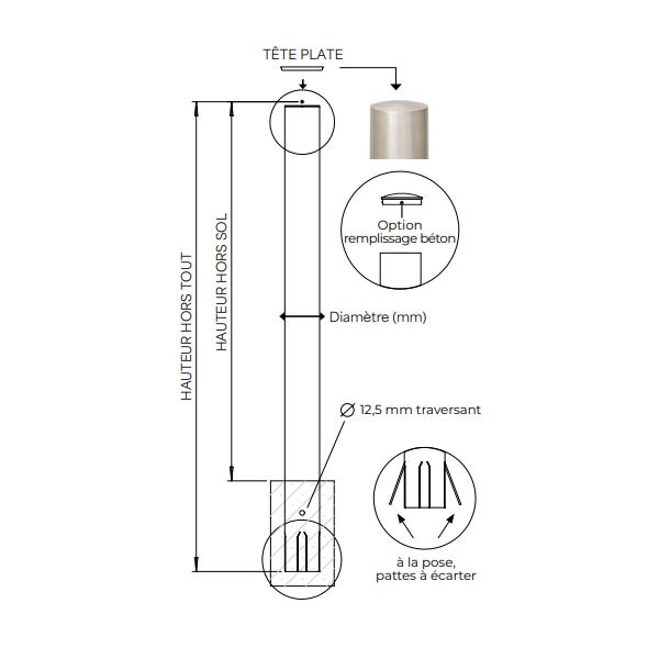 Potelet de ville inox tête plat - A sceller - Ø. de 60 à 140 mm - Hauteur...