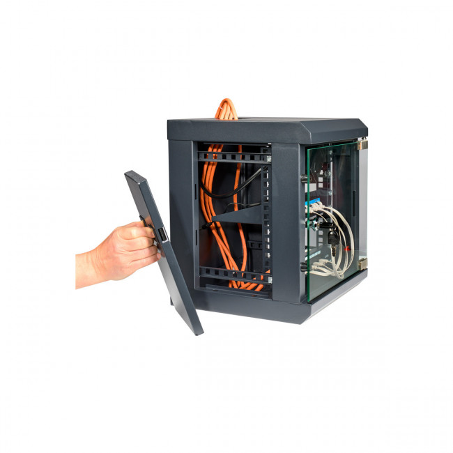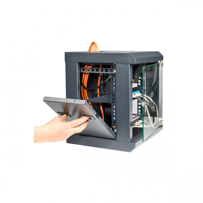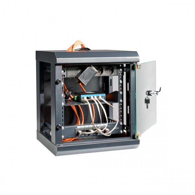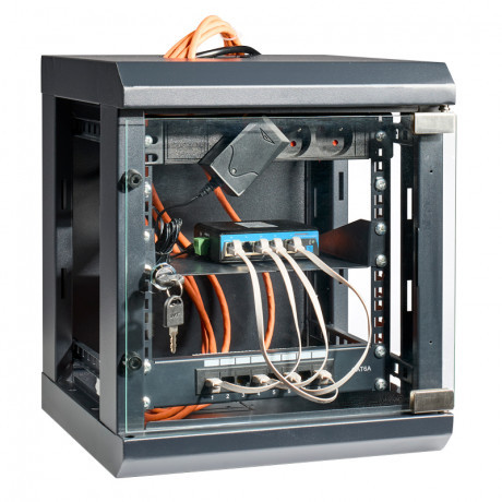 La Baie de brassage à connecteurs RJ45 est un boitier mural en acier avec un panneau de brassage composé de 8 connecteurs RJ45 CAT6, un panneau de 3 prises 2P+T 16A et une tablette libre pour Box/ Routeur.