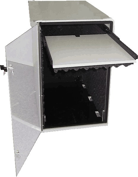 - Porte d'accès au serveur en PMMA transparent de 6 mm d'épaisseur, montée sur trois charnières en polyamide.
