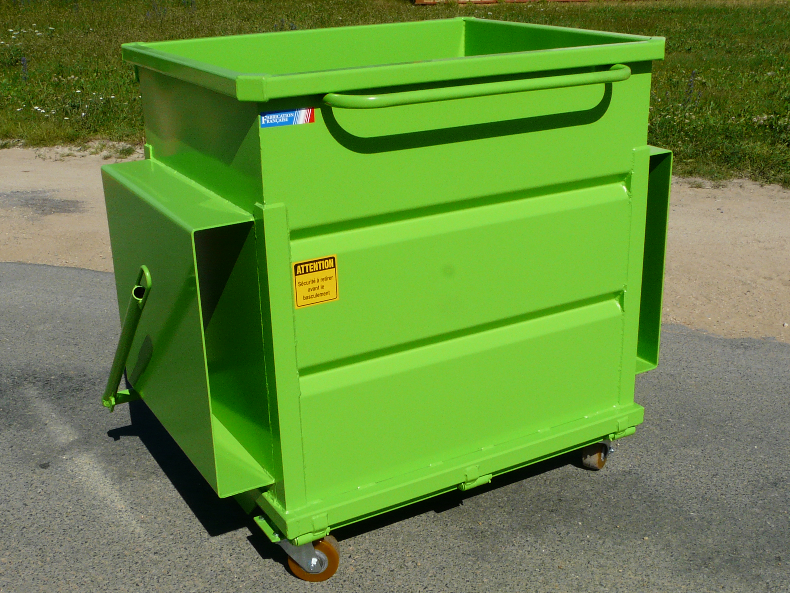 Bonjour, Nous sommes à la recherche d"une benne basculante avec prise de chariot à pinces d"environ 2m3. Ce serait pour mettre de l"acier en vrac venant de notre tri.