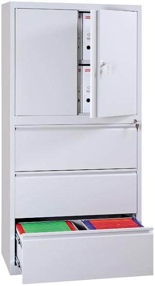 Cette armoire de bureaufixe convient pour un rangement combiné :