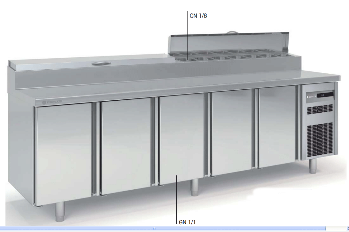 Il est composé d’un dessus en inox pouvant accueillir des bacs GN 1/3 profondeur 150 (sauf pour les 3 au dessus du groupe en profondeur 65) avec couvercle rabattable, et d’une alarme haute et basse température sur contrôleur digital.