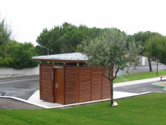 Nos atouts : Lacanau : toilettes doubles avec habillage persienne pour s’adapter à l’environnement architectural