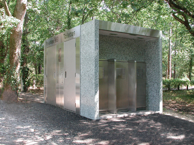 Nous souhaiterions implanter dans un parc, à proximité d"une infrastructure existante, un bloc WC PMR (1 WC homme et 1 WC femme) et des urinoirs extérieurs.