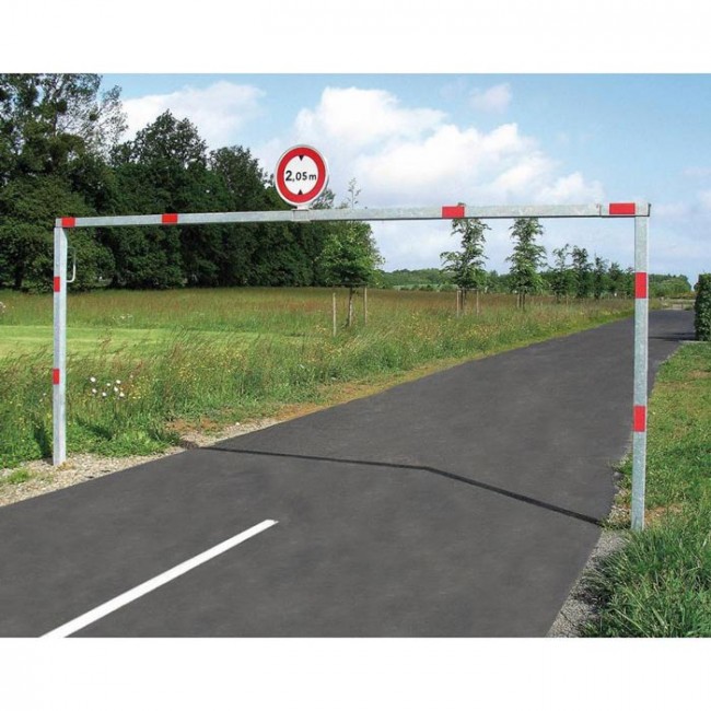 Portique de gabarit ouvrant laqué blanc avec balisage rétro-réfléchissant rouge.