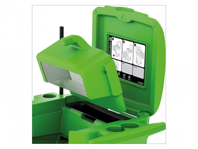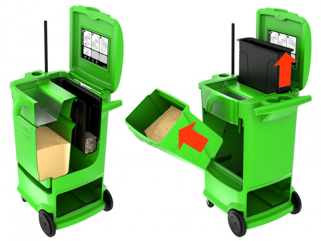 Chariot recycleur d'absorbant tout en un, il stocke, distribue et recycle son absorbant naturel Fibercan (absorption efficace qui ne laisse pas de film gras).