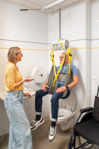 Le moteur portable, associé à la sangle de toilette, permet un accès simplifié aux toilettes, favorisant l'autonomie et le confort de la personne en situation de handicap.