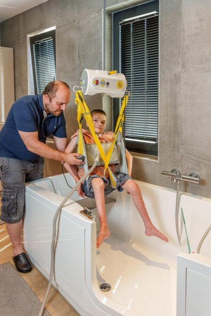 Le moteur portable facilite les transferts pour les bains, permettant à l'utilisateur de descendre et remonter de la baignoire avec aisance.