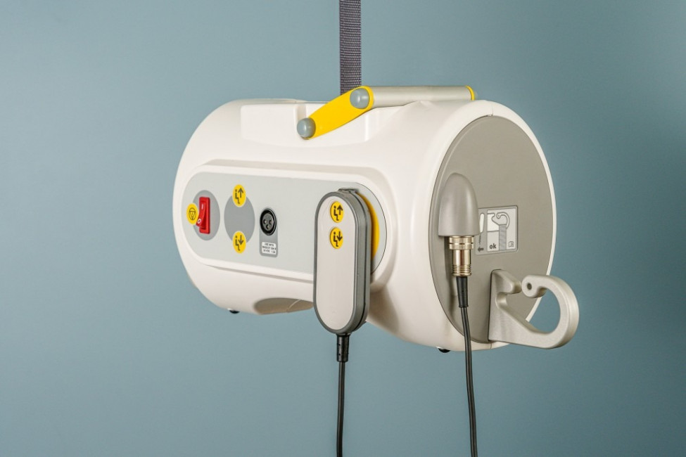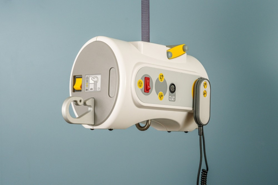 Les transferts entre le lit et le fauteuil roulant sont rendus confortables et sûrs grâce au moteur portable, géré par une commande filaire spiralée pour un maintien parfait.