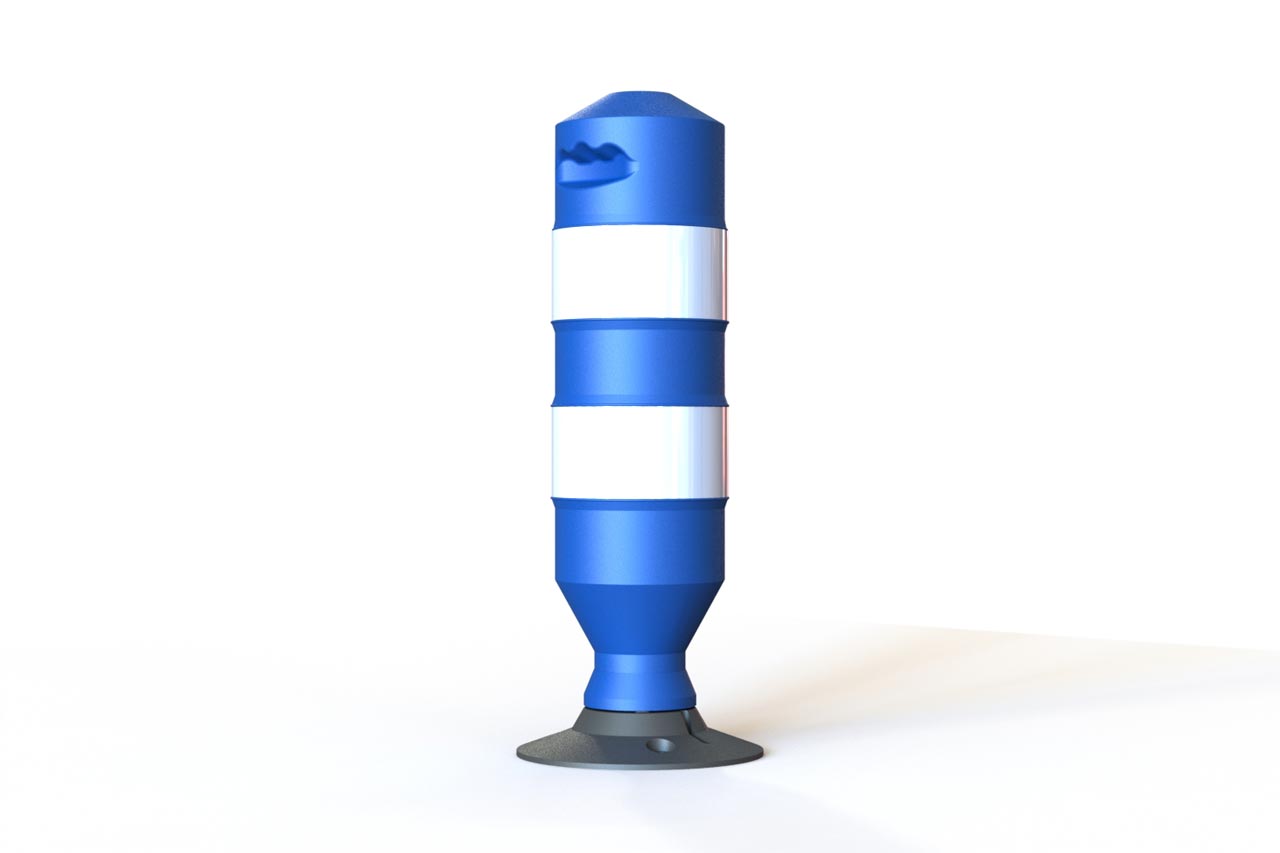 Elle mesure 750 mm de hauteur et 200 mm de diamètre. Sa fixation s’effectue par un système d’un quart de tour sur une base en caoutchouc recyclé.